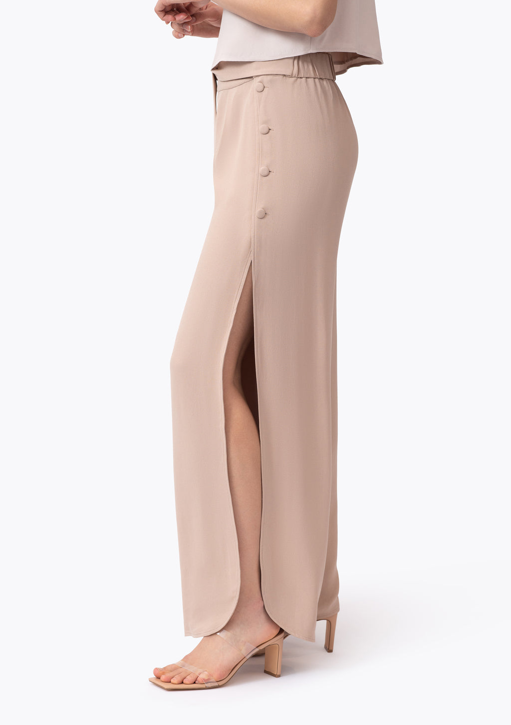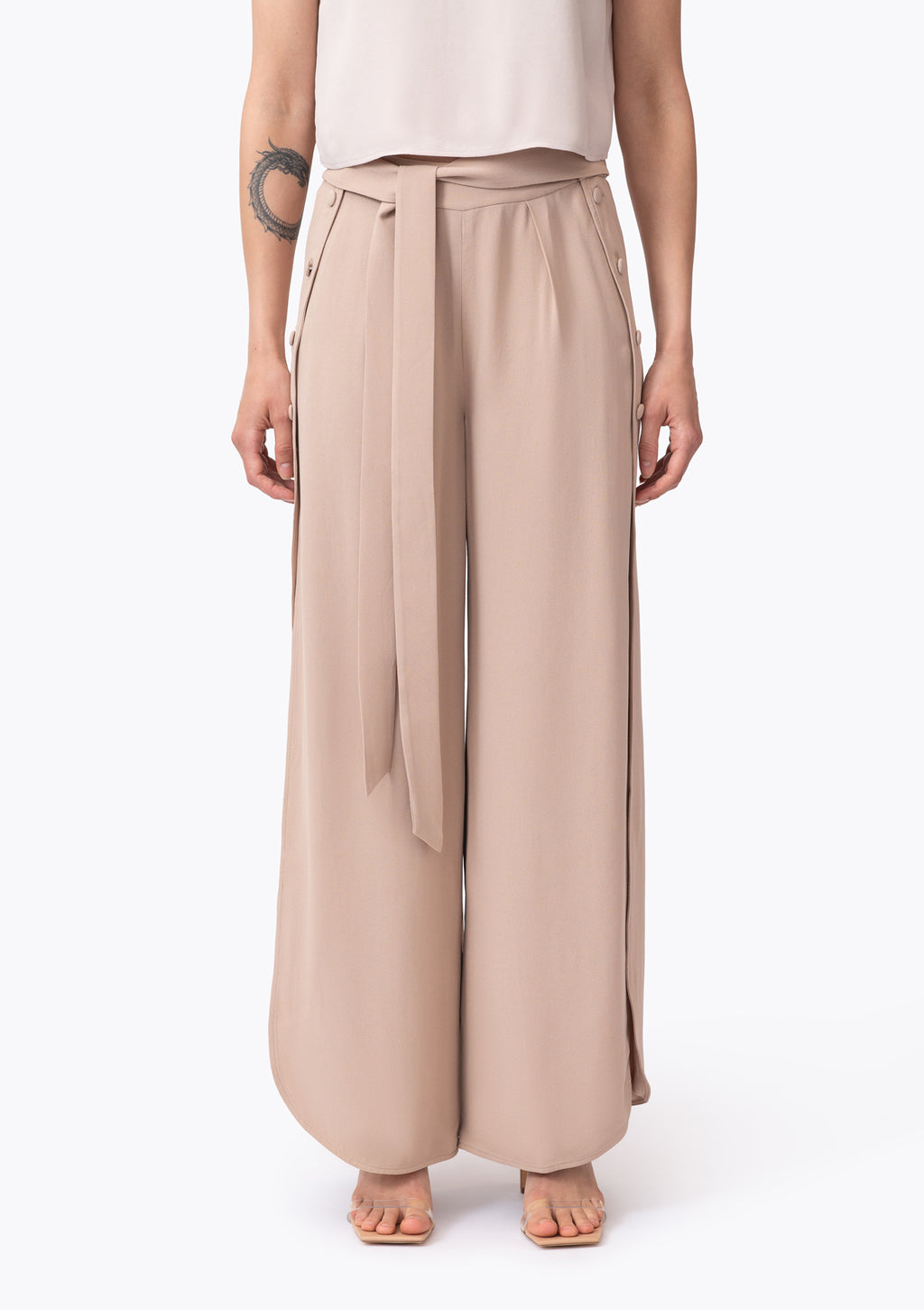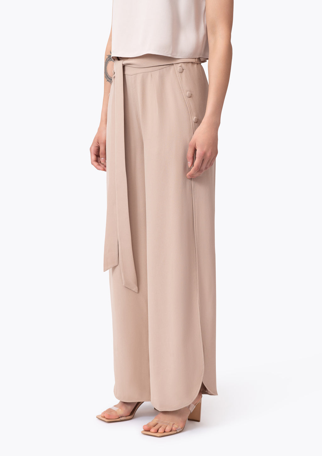 The rich drape, elongated proportions, and dramatic slit of the Arya pant take everyday wear to sophisticated new extremes. The buttery viscose crepe is enhanced by a relaxed cut and soft tie bow at the back. Buttons tracing the sides add functionality while accentuating and flattering the high-waisted silhouette.