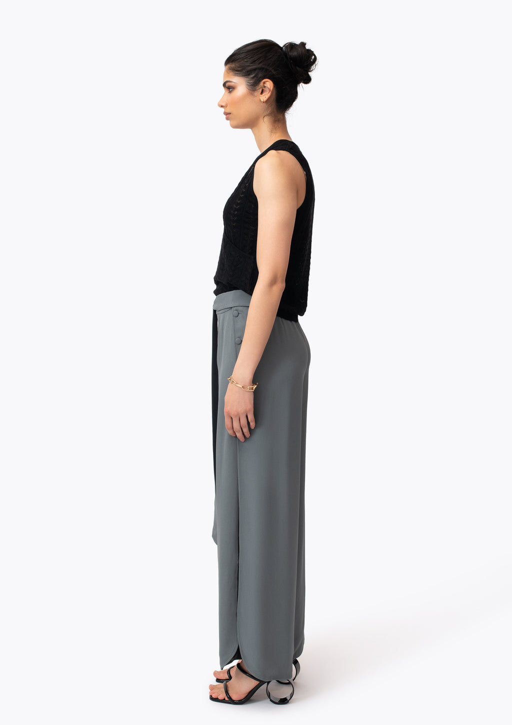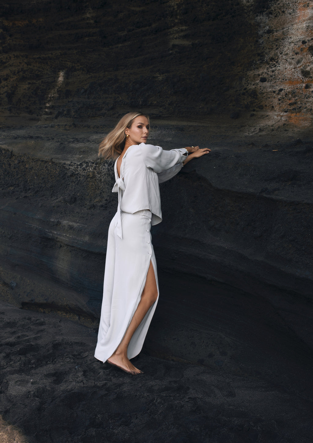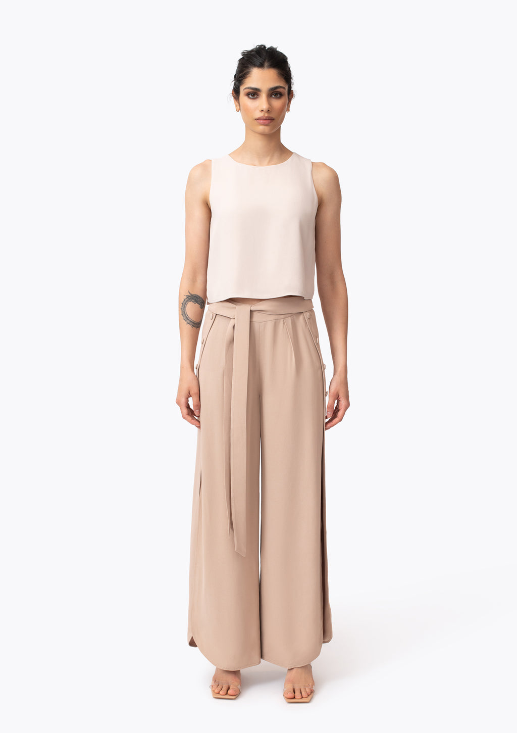 The rich drape, elongated proportions, and dramatic slit of the Arya pant take everyday wear to sophisticated new extremes. The buttery viscose crepe is enhanced by a relaxed cut and soft tie bow at the back. Buttons tracing the sides add functionality while accentuating and flattering the high-waisted silhouette.
