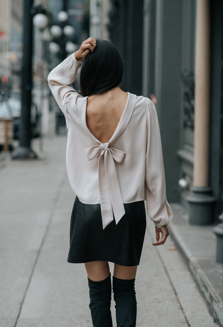 Estere is a study in modern elegance: refined, yet effortlessly wearable. Framed by a crisp peter pan collar, Estere is softened by relaxed sleeves, a dropped bow in the back, pleated shoulders, and a hip-length hem. Soft lines trace the body in viscose crepe: a rich material selected for its softness, fluidity, and breathability. Sleeves fasten with a single button at the wrist.