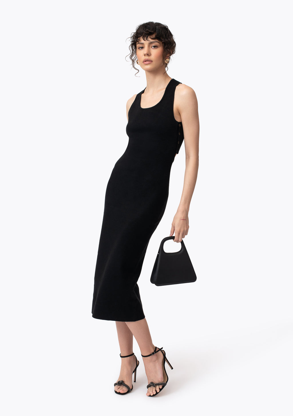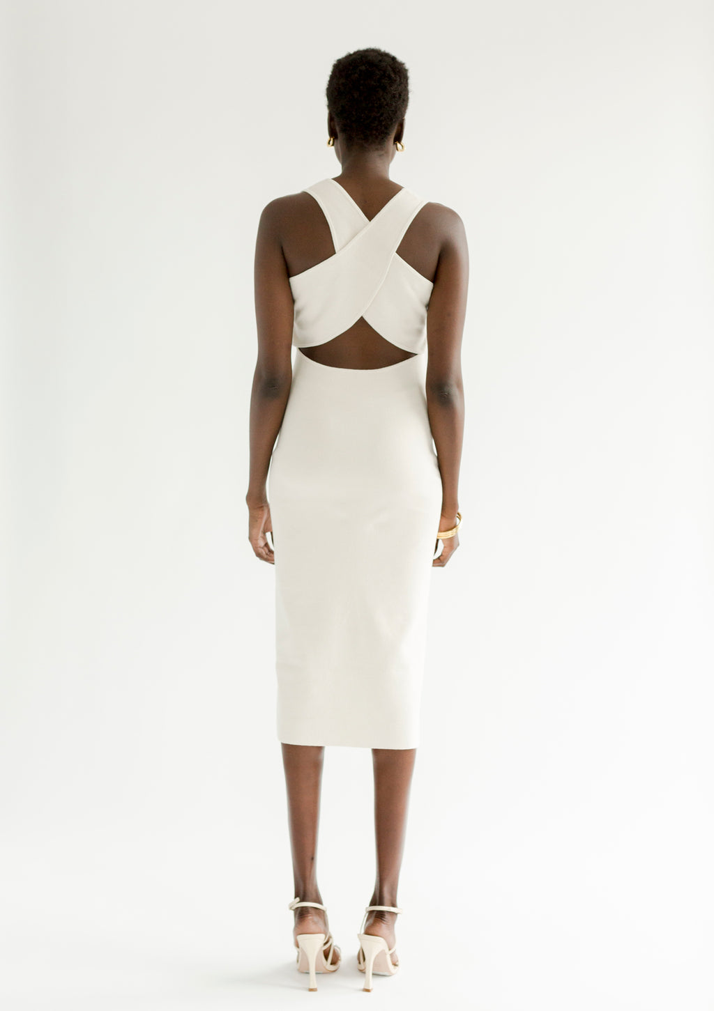 An elegant standout of the Signature Knitwear Collection, this cross-back midi dress is designed for an effortless, figure-skimming fit. The finely-ribbed linen blend knit was selected for its gentle stretch and structure, while delicate button details at the side add intrigue and function. An oval neckline, classic midi length, and exposed back suggest an air of sophistication and ease. For a daring look, the dress can be reversed and worn with the crossover in front.